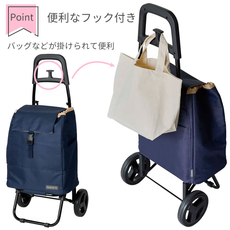 カートの背面にフックが付いているので、スーパーのカートに掛けることができます。