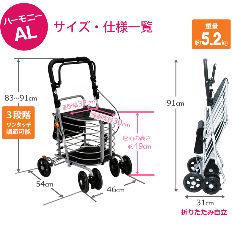| 本体サイズ | 幅46×奥行54×高さ83~91cm | 折りたたみサイズ | 幅46×奥行31×高さ91cm |
