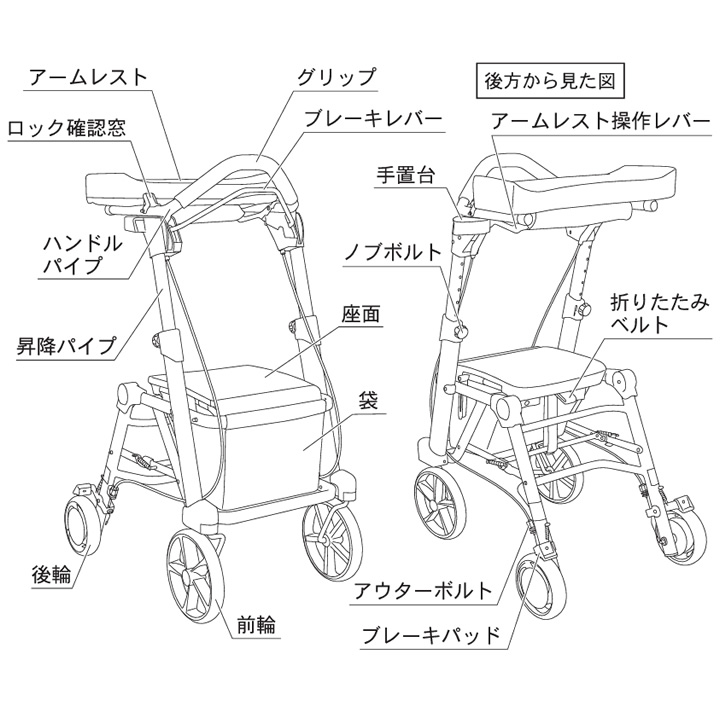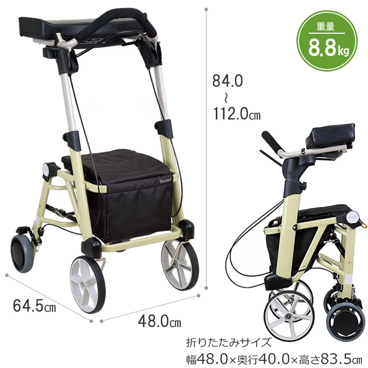 車体幅がコンパクトなので取り回しがよく、屋外はもちろん屋内でも扱いやすい歩行車です。