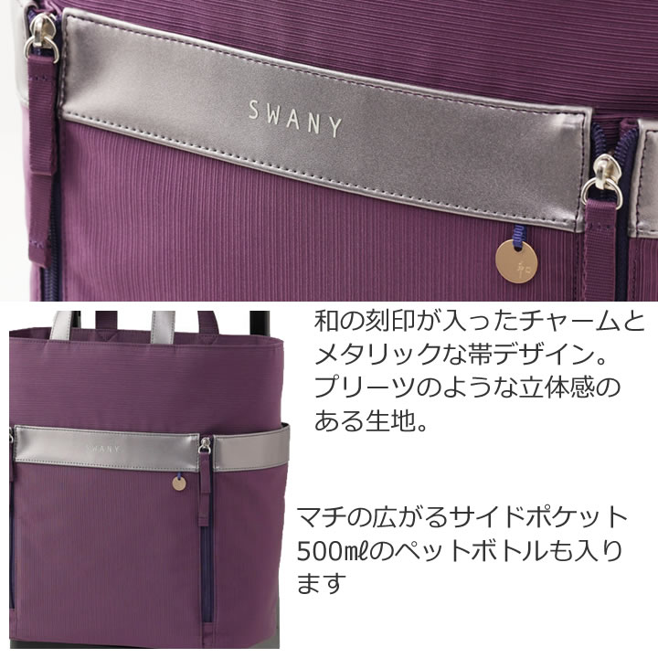 バッグの帯部分と持ち手部分に配色されたメタリックカラーがアクセントに。