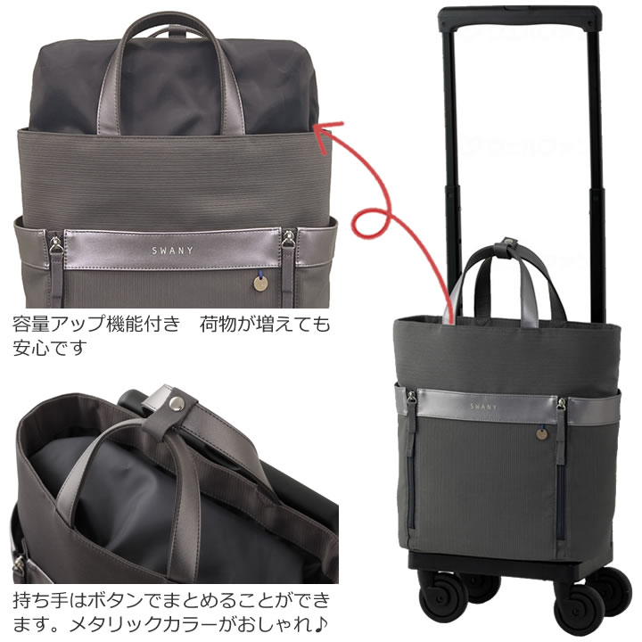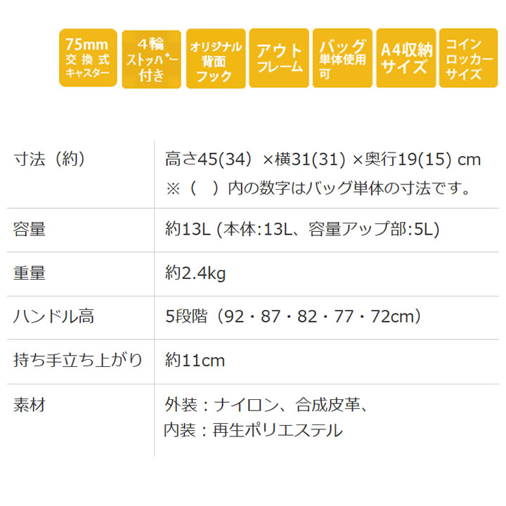 | 詳細 | サイズ:約幅31×奥行19×高45cm 重量:約2.4kg バッグサイズ:約幅31×奥行15×高34cm バッグ容量:約13L ハンドル高:5段階(92・87・82・77・72cm) 持ち手立ち上がり:約11cm |