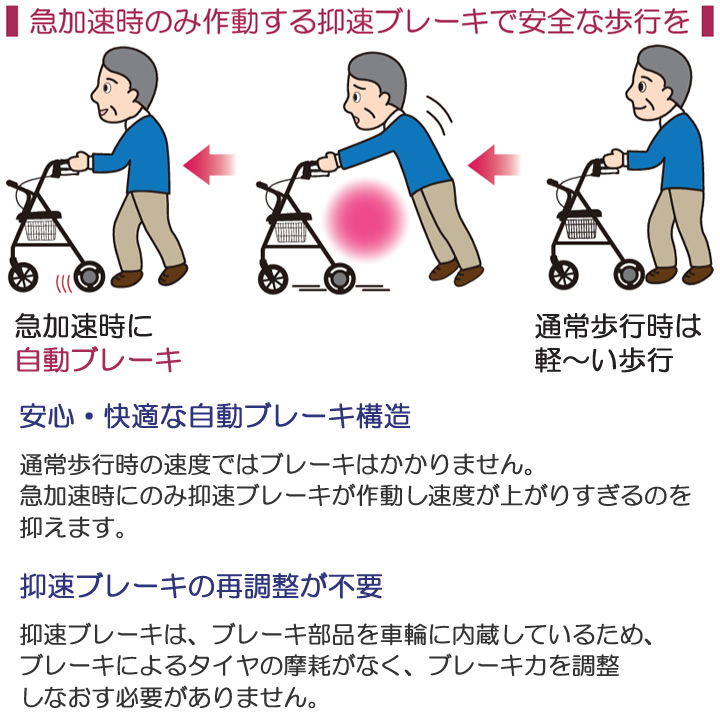 急加速時のみに作動する ハッピー抑速ブレーキ2 付き歩行車で安全な歩行を。