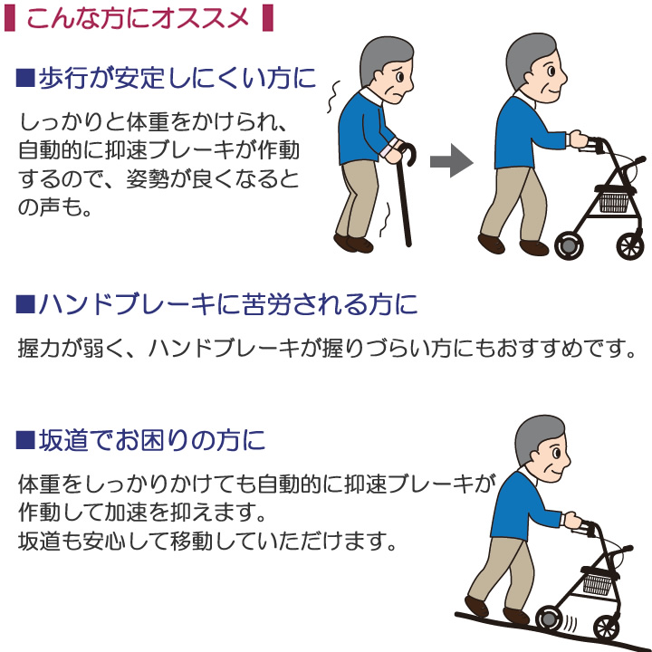 歩行車に追いつけずに転倒…と不安を感じていたら抑速ブレーキ付きがおすすめ。