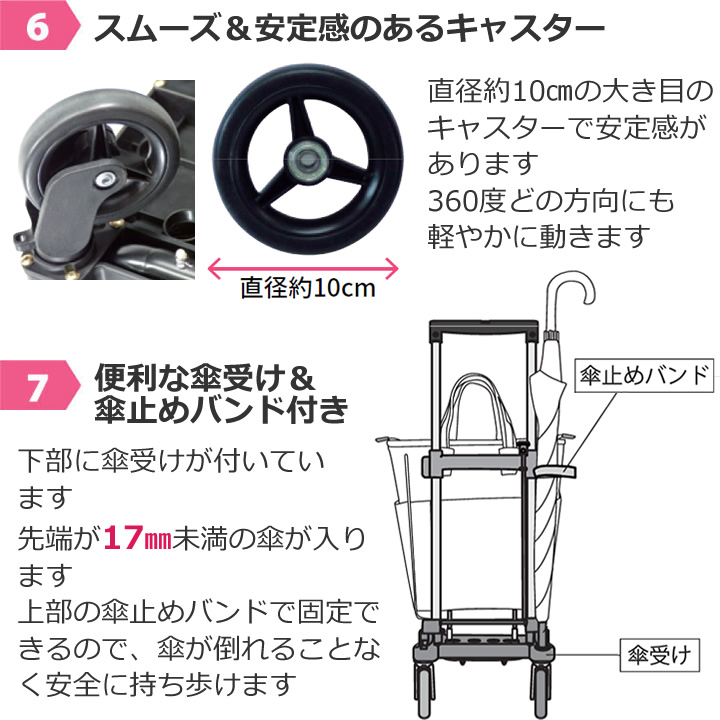 上部の傘止めバンドで固定できるので、傘が倒れることなく安全に持ち歩けます。