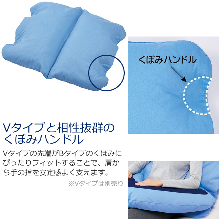 別売りのVタイプの先端がBタイプのくぼみにぴったりフィットすることで、肩から手の指を安定感よく支えます。