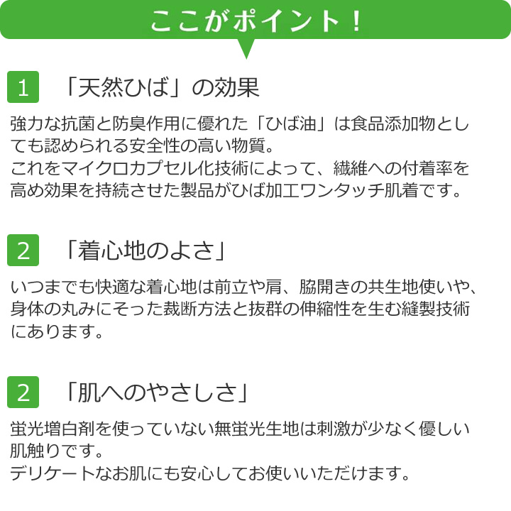アトピーの原因にもなるダニ等にも効果(忌避効果や抗カビ作用)のある「ひば油」をマイクロカプセル化技術によって、繊維への付着率を高め、効果を持続させるようにしたのが、ひば加工ワンタッチ肌着。清潔、さわやかいろいろな菌の繁殖を抑え、不快なにおいを追放します。