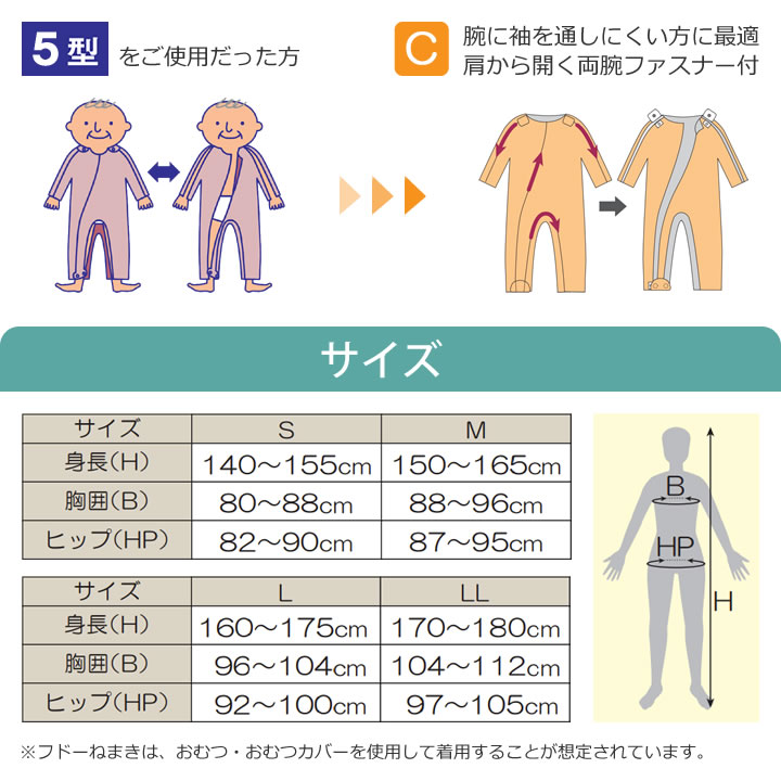 ○足元から首元にかけて開き、股部分・両腕部分も開閉可能で、より着替えや清拭がスムーズに行えます。