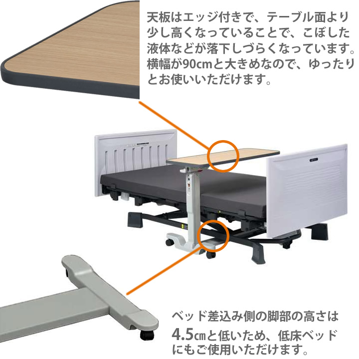ベッド差込側の脚部の高さは、4.5cmと低いため、低床ベッドにもご使用いただけます。