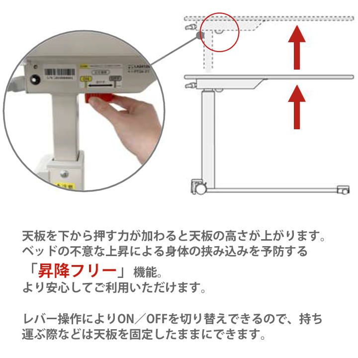 ベッドの不意な上昇による身体の挟み込みを予防する「昇降フリー」機能。
