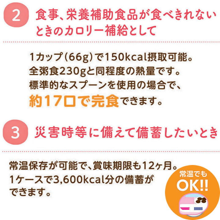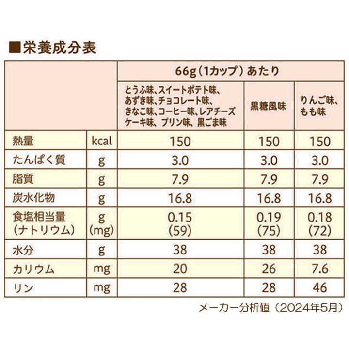 1カップ(66g)あたり150kcalで、手軽にカロリーを補給できます。