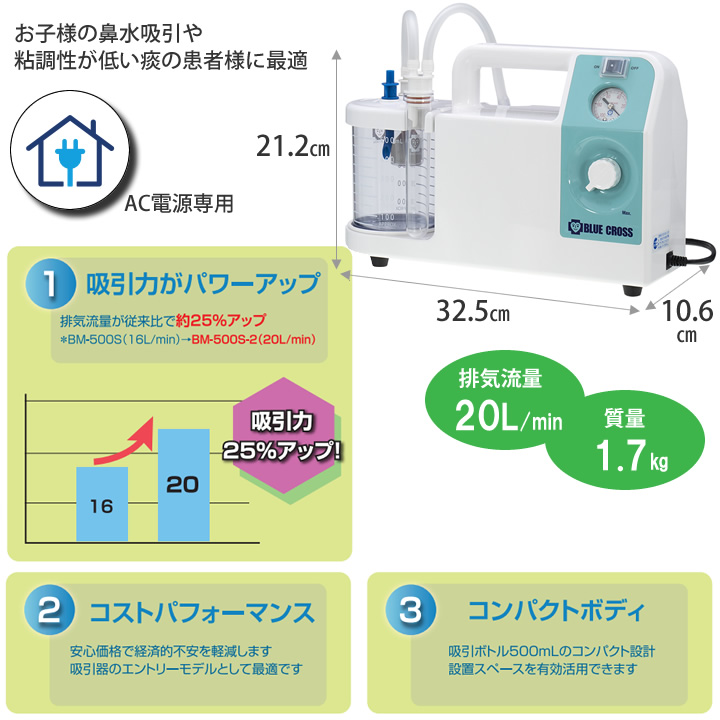 - BM-500S-2は、BM-500Sの吸引力がパワーアップした後継商品です。