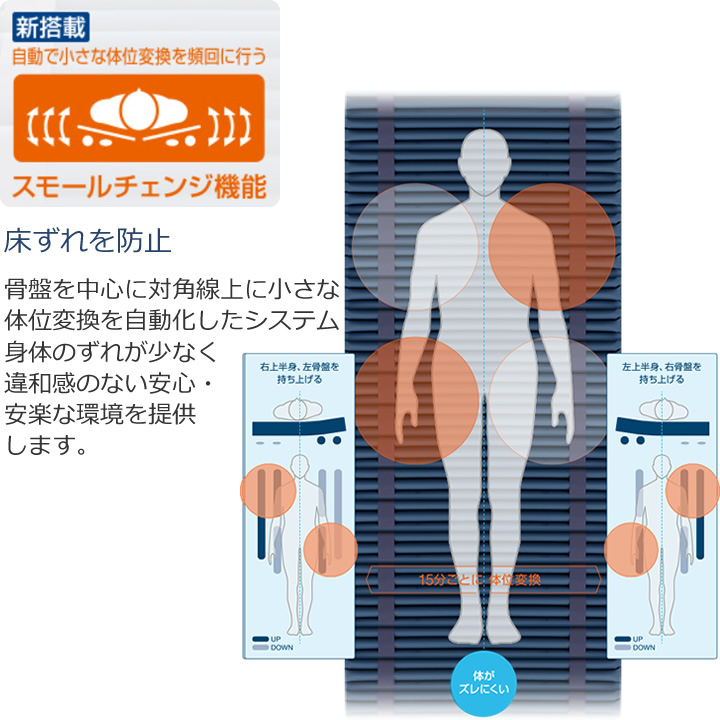 骨盤を中心に対角線上の小さな体位変換を約15分間隔で行うシステムです。