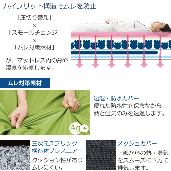 「圧切替」×「スモールチェンジ」×「ムレ対策素材」が、マットレス内の熱や湿気を排気します。