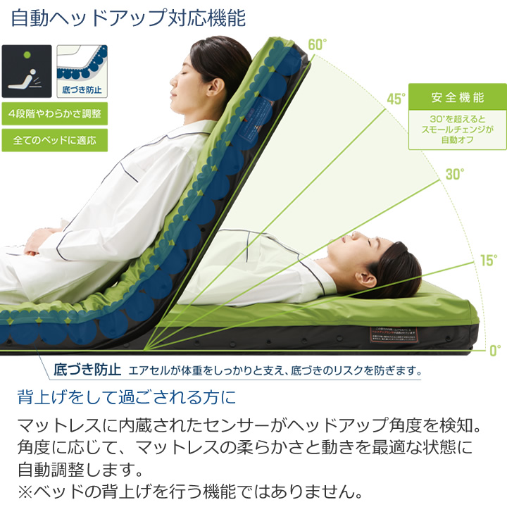 角度に応じて、マットレスのやわらかさと動きを最適な状態に自動調整します。