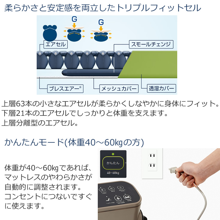 「かんたんモード」では、エアマットレス利用の半数以上を占める40~60kgの方に対応。