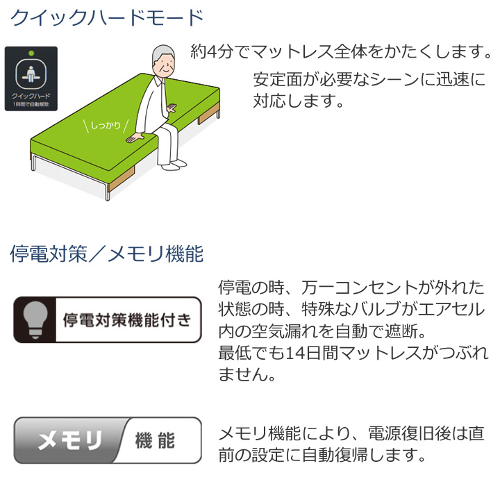 停電の時、万一コンセントが外れた状態の時、特殊なバルブがエアセル内の空気漏れを自動で遮断。
