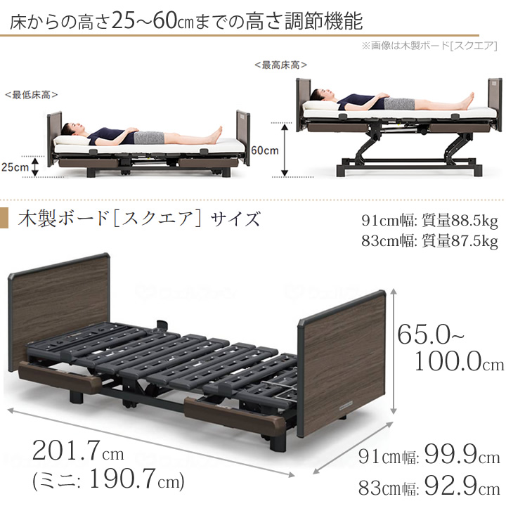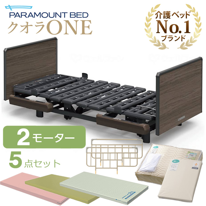 KQ-B6227 KQ-B6207 クオラONE(クオラワン) 2モーター 木製ボード[スクエア] 選べるマットレス付き サイドレール付き マットレスパット&ボックスシーツ付き 商品詳細 介護ベッドのカスタマーネット