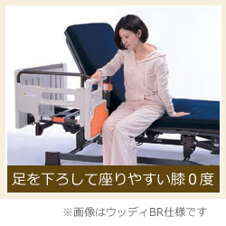 また、どの角度でも腹部の角度を100°以上に保つ設計なので腹部圧迫の心配もなくご利用者様にもご家族様にもやさしい電動ベッドになっています。 ベッドから足を下ろして座りやすいよう、膝は0度に。 座っている姿勢に安定感があるため、ベッドから車椅子への移動を安全に行えます。 |