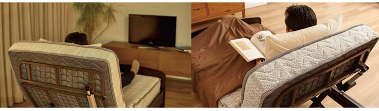 モーターの動きが背上げアームに伝わり、背もたれを押すことで背上げを行います。 背上げアームと背もたれは離れている為、背もたれを下げる時は背上げアームが下がることにより背もたれが下がる構造になっています。 背もたれの下に腕や物が挟まっても、モーターの強力な力で押し挟まれることはありませんので、リクライニングを安心してご利用になれます。 |