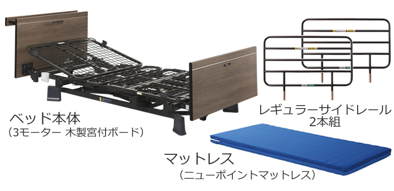 P113-31BB ミオレット3(MioLet3/MioletⅢ)3モーターベッド木製宮付き(棚付き)ボード3点セット サイドレール(手すり/柵)付き マットレス付き 商品詳細 介護ベッドのカスタマーネット