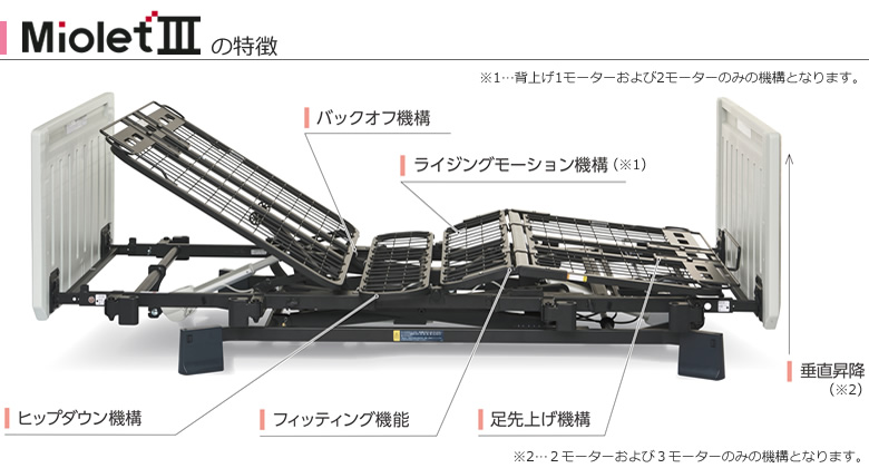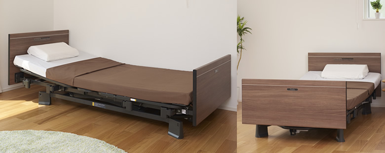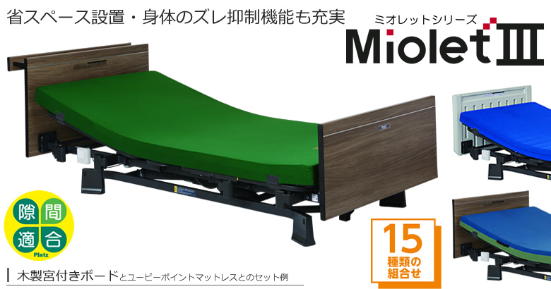 ![]() スタンダードモデル「ミオレット2」の後継機として、「垂直昇降」「3段階のサイズ変更」「パーツの軽量化」を実現。 「低床」「省スペース」「移乗のしやすさ」「身体のズレ抑制」などのご利用者様のメリットだけでなく、「サイズ&機能変更可能」「パーツの軽量化により腰痛予防」などで介助する方にもやさしい介護ベッドです。 3種類のボードと3種類のモータータイプからお選びいただけます。