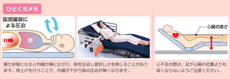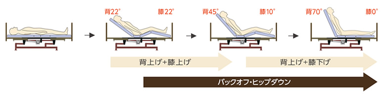 ![]() ![]() ご利用者の大腿部の長さに合わせ、パーツの変更なしでひざ脚ボトムが曲がる位置を2段階に調節できます。 ズレの少ない快適な姿勢をサポートします。 ![]() ![]() 背上げボタンを押すと、背と膝の角度を自動的に調整しながらリクライニングをおこなうことにより、足方向へのズレを抑制します。 背を上げ続けると膝は下がることで腹部の圧迫を抑え、背を上げきると膝はフラットになり 端座位も取りやすくなります。 ※背上げ単独動作への切り替えもワンタッチで可能です。 |