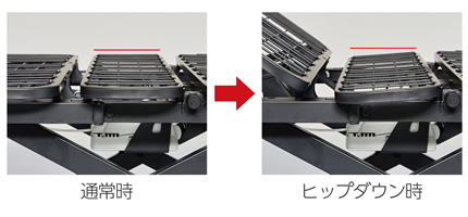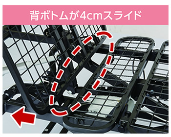 背上げと連動してお尻の部分のボトムが斜めになります。 これにより、骨盤を起こしズレを抑制します。 |