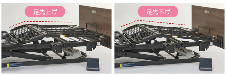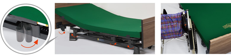 ![]() ![]() 足先の角度をワンタッチで切り替えできます。足のむくみ(浮腫)の軽減にも対応できます。 ![]() ![]() ![]() すべてのサイドレールホルダーは簡単に収納ができます。 車いすをよりベッドに近づける事が可能になり、安全に移乗できます。 |