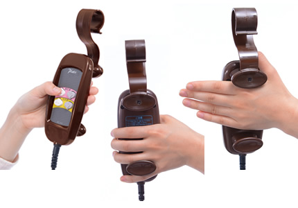 | 手元スイッチ裏面にあるダブル・ホールドマウントにより指の間にひっかけて保持することができます。 手が動かしにくい方でも握りやすく、使いやすいデザインです。 |
