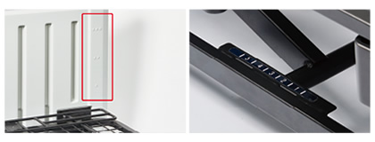 樹脂ボードには背角度の目安となるマーク、ベースには昇降高さの目安となるローラーガイドがあり、適切な位置を確認しながらベッドを操作することができます。 |
