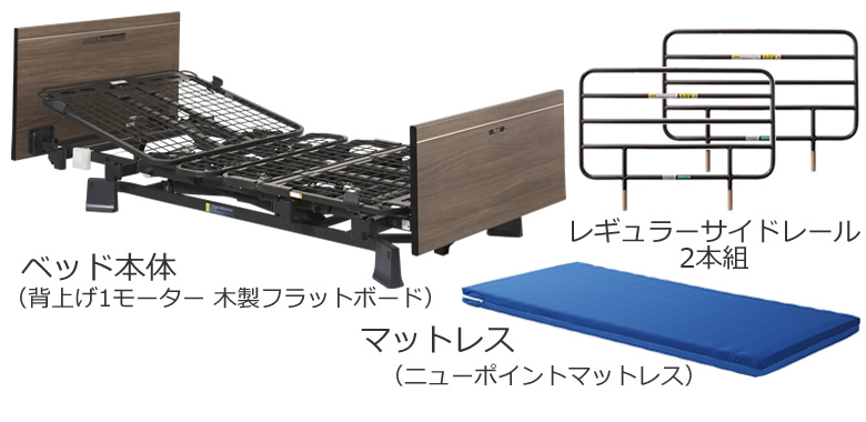 - ミオレット3(MioLet3/MioletⅢ)・背上げ1モーターベッド・木製フラットボード・3点セット サイドレール(手すり/柵)付き マットレス付き