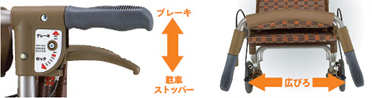 | 左右についているレバーのどちらでもブレーキがかけられ、レバーを下にさげれば駐車ブレーキがかけられるので手元の簡単操作で使いやすくなっています。 また、ハンドル部は幅を広くしてあるので、身体をよりシルバーカー本体に近づけれるので姿勢が悪くなりにくくなっています。 |