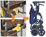 | 座面の下にある開閉レバーを解除して、ハンドルを下にスライドするだけで簡単に折りたたみが出来コンパクトになります。 また、折りたたんだ状態でも自立するので置き場所に困りません。 |
