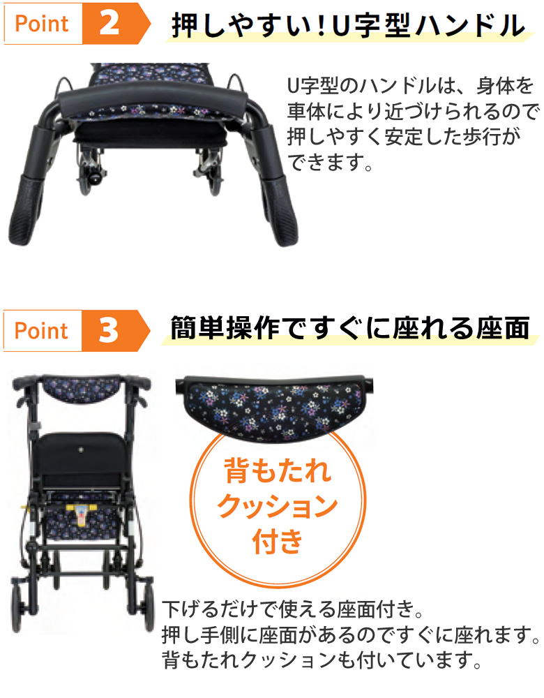 U字型ハンドルは、身体を車体により近づけられるので、押しやすく安定した歩行ができます。