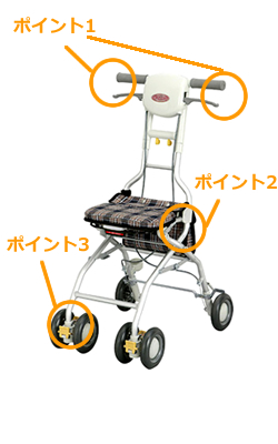 1.後ろのスイッチを上げると、直進で固定できます。 2.前の直進スイッチを上げて、後ろのスイッチを下げると、左右60度首ふりし、スプリング効果で、直進方向へ戻ります。 3.前と後ろ、両方スイッチを下げると左右60度、首ふりします。 | 軽量でコンパクト なシルバーカーです。 ハンドルの高さ調節 や折りたたみが簡単 にできます。室内でも使えるコンパクト。 |