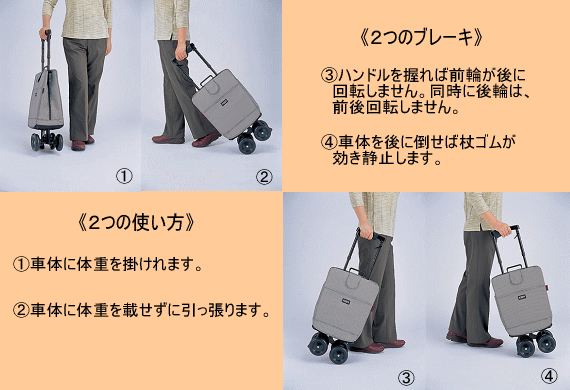 | 上記のようにブレーキは手元のハンドルで簡単にできます。車体に体重をかけれるので楽々買い物ができます。 |