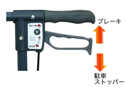 | レバーを握るとブレーキ、下に倒すと駐車ストッパーがかかります。ブレーキ&2WAYブレーキ。ブレーキ・ストッパーの一体型システム。 | |
