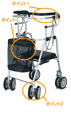 ●体重移動の変化で倒れない設計。 ●歩行途中で休める座席付きです。 ● ハンドルの高さ4段階調整(84/89/94/99cm) |