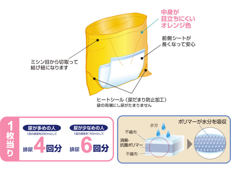 ・消臭・抗菌ポリマー吸収シートの前面が長く、尿のはね返りを防止。