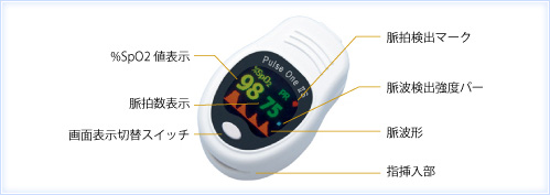 測定方法 | パルスオキシメトリ法 | 測定範囲 | SpO2 0-100% 脈拍数 30-250回/分 |