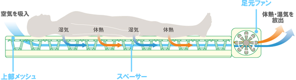 | 寝ている間ずっとそよ風が足元へ循環し続けます。 | ||
