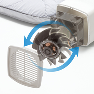 | 足元の両側のファンが回転することによりマット上面から外気を吸入。 常に身体の下に新鮮な風が通り、マットと密着している面の汗や体熱も一緒に吸い込み排除するので、汗をかいてもべとつかず朝までさらさらの状態を保ちます。 送風量は1分間に最大300L(2Lのペットボトル150本分)の風が通り抜けるのでいつでもさわやかな風の吹く草原に寝ているみたいです。 送風量はATEX社内にて無負荷状態で測定 | ||