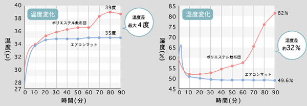 ![]() | ←サーモグラフィで撮影 温度26℃、湿度50% 15分寝た直後のマットの表面と背中の温度をサームグラフィで測定しました。 一般の布団では背中が35℃を超える部分がありますが、「エアコンマット そよ」では一番温度が高い部分でも32℃と3℃もの違いが出ました。 ↓グラフで比較 温度28℃、湿度70% マットと背中の間に湿温度センサーを置いて90分寝た場合 送風おやすみモード(10分間強のあと弱で送風) 最大温度差4℃、最大湿度差32%と効果を発揮!! 特に蒸し暑い日本の夏には必需品です。 ※中綿:ポリエステル製布団を使用 |