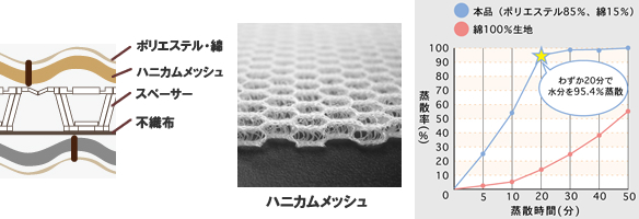 | 優れた通気性と弾力性を生むハニカム形状の生地を速乾性に優れた表生地に重ねてキルティング加工を施しました。 汗等の水分をすばやく乾燥させ朝までさらさら状態をキープします。 | |