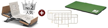 新背あげ・ラクリアモーション(2モーション)の電動介護用ベッド。木製ボード。快適に使える6点セット。スマートハンドル付。