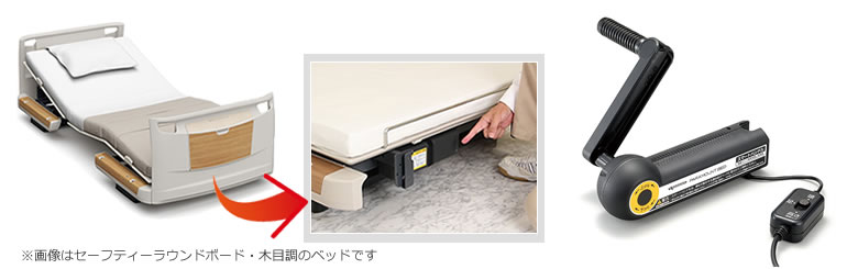 ■ 細部に至るまでこだわった 安心・安全・使いやすい ![]() ■ 停電時にもベッドを手動で操作できるスマートハンドルが付属 ![]() 災害などによる停電のときでも、ベットを手動で操作できるスマートハンドルが付いています。 コードをつないだまま収納ケースに入れてベットに備え付けできるので、必要なときはすぐに使用できます。 どのような時でも、ベットを平らな状態にできるので、快適な角度で安心してお休みいただけます。 切換スイッチの操作で「頭」「足」「高さ(頭側の高さ下げ)」を切り換えることができます。 ※スマートハンドルではベッド全体の高さ調節はできません。 ■ 選べるベッドサイズ※サイズは、対応するマットレスの長さ・幅です。 ![]() |