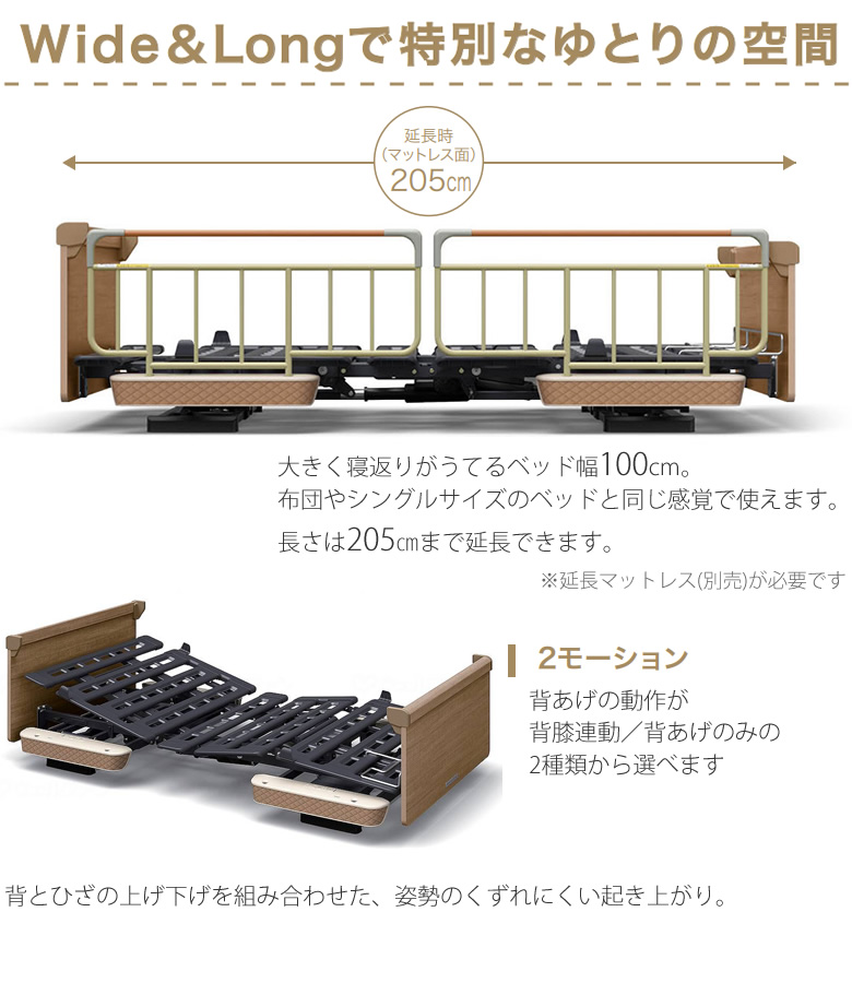 100cm幅のワイドサイズで特別なゆとり空間 2種類の背あげ機能とベッドの高さ調節機能を搭載