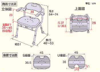 | サイズ: | 幅51×奥行46×高さ64~74cm(座面までの高さ35~45cm) (折りたたみ時:幅51×奥行29×高さ87cm) |