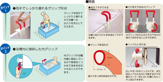 浴槽内側の手すりで立ち座りをサポート。手すりを取り付けたままでもお風呂のふたができます。
