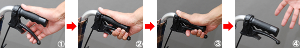 | 1.ブレーキとストッパーを同時に握ります。 2.ストッパーから人差し指だけをはずします。 3.はずした人差し指をブレーキとストッパーの間に入れます。 4.手を離します。 1~4だけの簡単操作で介助者様のお手元で一時停車用としてブレーキがかけられます。 走行時のブレーキはドラム式介助ブレーキ付きで安心して雨の日でも、坂道が多い場所でもご利用頂けます。 ※乗り降りや・斜面で停車される場合には必ず駐車ブレーキレバーを操作して下さい。 |